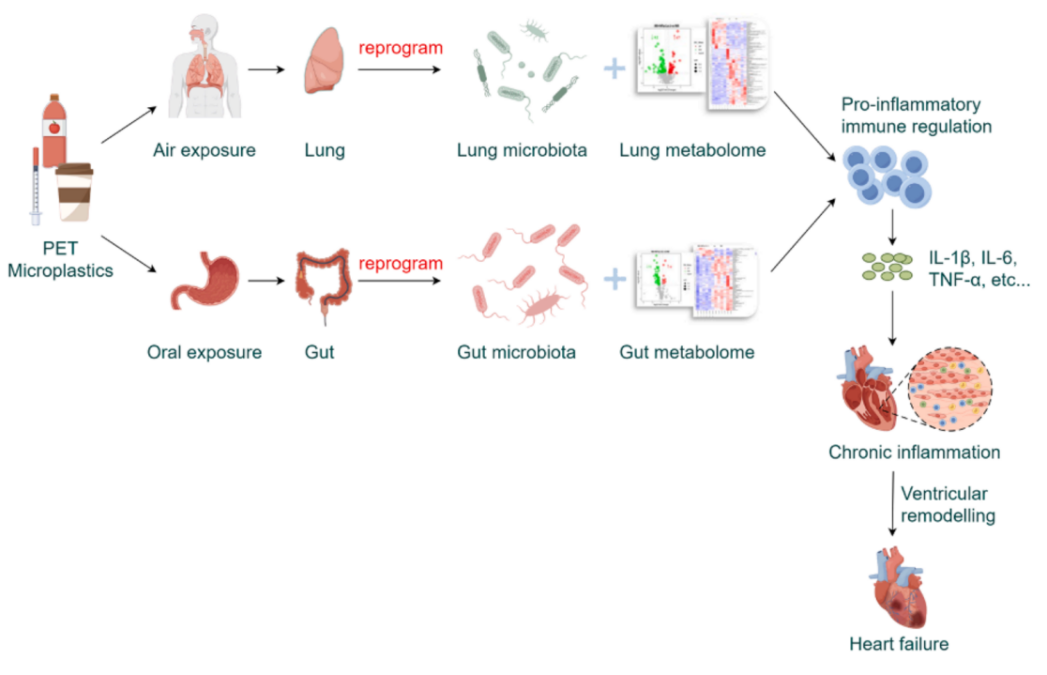 2025年5月,伟德国际victor1946/附属医院心内科王晓彦教授、顾鑫医师团队联合南京医科大学杜颖强等人,在环境科学领域知名期刊《Journal of Hazardous Materials》发表题为"Exposure to polyethylene terephthalate micro(nano)plastics exacerbates inflammation and fibrosis after myocardial infarction by reprogramming the gut and lung microbiota and metabolome"的研究成果。该研究首次揭示环境微塑料污染与心血管疾病进展的分子机制关联,为评估微塑料暴露的临床风险提供了证据。研究团队通过临床样本检测,在急性心肌梗死患者冠状动脉循环中检出微塑料,这一发现提示微塑料暴露可能构成心血管疾病的新型风险因子。针对PET这一广泛应用于食品包装、纺织等民生领域的高分子材料,团队构建心肌梗死(MI)动物模型,创新性地采用多组学整合分析策略,结合心脏功能评估、肠道/肺脏代谢组学及宏基因组测序技术,揭示PET微塑料通过重塑肠道-肺脏微生物生态、干扰宿主代谢网络、激活免疫炎症级联反应,最终加剧心肌梗死后炎症及纤维化的作用机制。该研究填补了PET微塑料心血管毒性机制研究的空白,对制定临床防治策略和公共卫生政策具有重要参考价值。