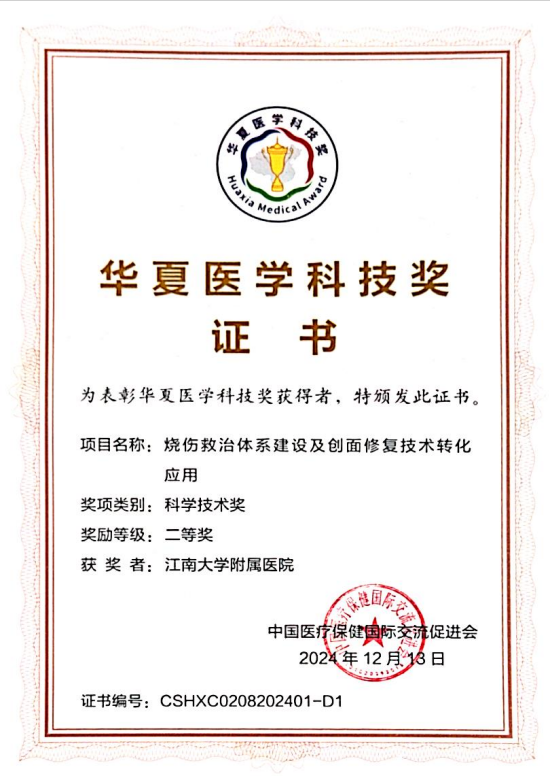 近日,2024年度华夏医学科技奖揭晓,作为第一完成单位,伟德victor1946附属医院烧创伤诊疗中心主任吕国忠带领团队申报的项目“烧伤救治体系建设及创面修复技术转化应用”荣获2024年度华夏医学科技二等奖。