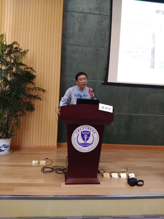 会议伊始,主持人对张国军老师进行了一个简单的介绍并对他的到来表示热烈的欢迎。紧接着,张国军老师由林语堂的作品《假如我是土匪》中的话“第一件,便是习书法”引入今天的话题:书法是半世的事业,学习要早。他从正反两个方面讲述了书法的实用性,他还提到生活中的书法是十分重要的,比如说医生开处方,就一定要写得能让别人认识,而现在一部分医生的书写过于潦草,被人们调侃为医生体。古代的医生开的药方,除了药用价值,还是一幅书法作品,具有收藏价值。其次书法除了实用性,还具有艺术性。对此张国军老师同样列举了大量生动典型的例子。最后,他和同学们详细地讲解了怎样学习书法并对练习书法提了些许建议,一是单个字练书法,“永”字最佳;二是同学们练书法,可以先练自己的姓名,有了一些信心之后,再练一些和自己密切相关的字,来了兴趣,便可以练习其他的字了。