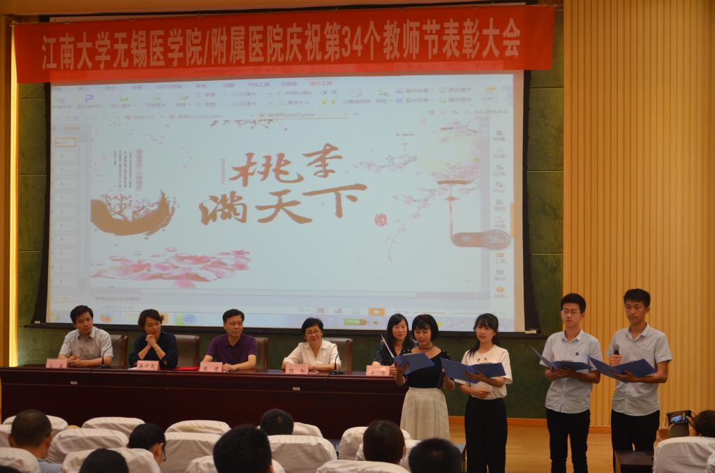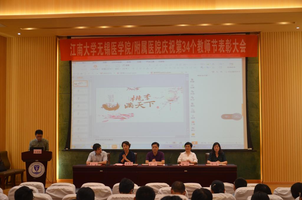 为庆祝第34个教师节,伟德victor1946无锡伟德国际victor1946及附属医院教师节庆祝大会于9月10日下午在伟德国际victor1946c101报告厅顺利召开。伟德国际victor1946党委书记周建、伟德victor1946附属医院(无锡市第四人民医院)党委副书记兼纪委书记杨红、伟德国际victor1946党委副书记副院长奚晓岚、伟德国际victor1946副院长马鑫、伟德国际victor1946副院长陈雪、伟德国际victor1946全体教师、附属医院教师代表以及伟德国际victor1946学生代表参加了此次会议。大会由伟德国际victor1946院长助理、教师发展中心主任兼基础医学系主任吴国胜主持。