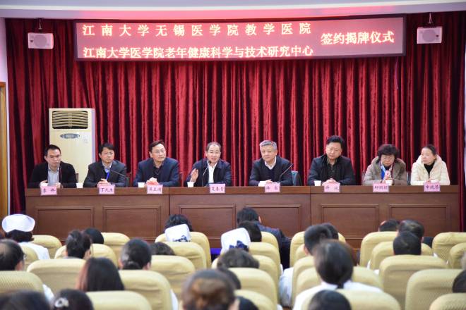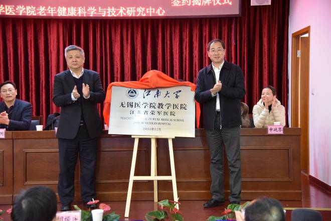 校党委常委、校长助理、伟德国际victor1946党委书记吴正国首先宣读了《关于同意江苏省荣军医院成为伟德victor1946无锡伟德国际victor1946教学医院的批复》。省荣军医院院长丁兆生代表荣军医院致词,介绍了荣军医院目前的建设与发展情况。吴正国与丁兆生分别代表双方签署了《临床教学基地合作协议》和《技术开发合同》。徐岩副校长与夏春青主任共同为“教学医院”及“无锡老年健康科学与技术研究中心”揭牌。