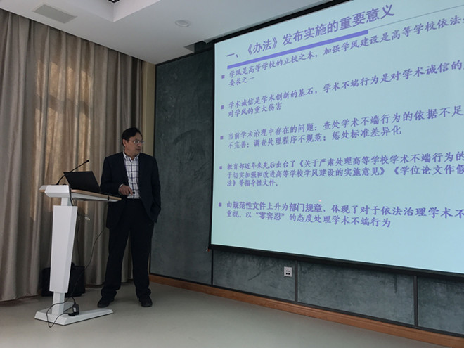辅导报告会上,吴书记从《办法》发布实施的重要意义、政府和高校在预防和处理学术不端行为中的职责、学术不端行为的教育与预防体系、学术不端行为的概念和类型、举报受理及组织调查的程序规则、对责任人的处理及救济制度、相关的保障与监督机制等七个方面为教职员工全面解读了《高等学校预防与处理学术不端行为办法》。