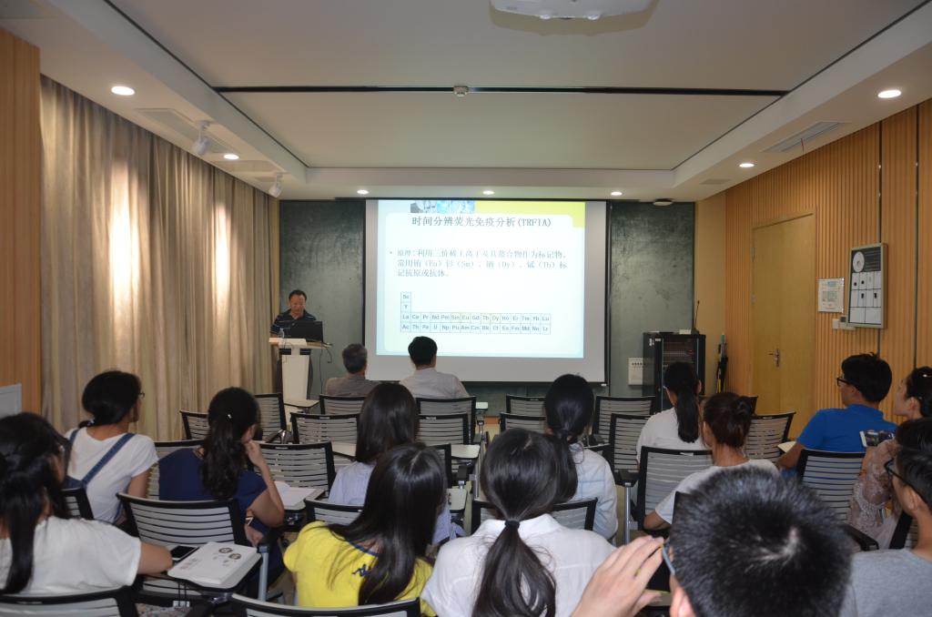 黄飚研究员作了题为《超微量免疫分析的研究及应用》的学术讲座。黄飚研究员一直从事高灵敏免疫分析的研究及产业转化,会上黄教授系统详细介绍了标记免疫分析,并将时间分辨荧光免疫分析(TRFIA)技术研发应用于验血查胃病、特发性膜性肾病的血清学鉴别诊断、各项肿瘤指标的检测、食品安全以及太湖水域中藻毒素的检测。同时,黄老师还介绍了溶瘤病毒治疗肿瘤的研究。讲座后,黄老师与在场师生就疾病精准诊断和肿瘤治疗的一些学术问题进行了深入的交流探讨。(文:杜梦繁、奚春华;图:奚春华;审核:马鑫)