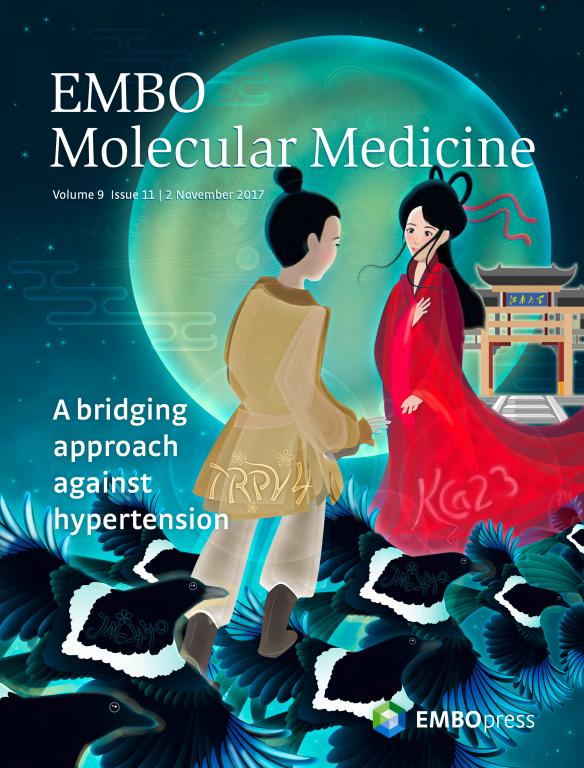 该项研究从基础医学和转化医学研究层面,丰富了高血压发病机制和干预策略的研究。这个故事也成为EMBO molecular Medicine 2017年第11期的封面故事“A bridging approach against hypertension”(一种对抗高血压的桥式设计新方法)。封面故事的设计,体现了科学和传统、融入了作者所在单位颇具江南传统风格的北大门,讲述了“鹊桥相会”的研究故事:小分子(JNc440,喜鹊)通过识别耦联损伤的TRPV4(牛郎)和KCa2.3(织女),以桥式保护的方式维护了血压的稳态。