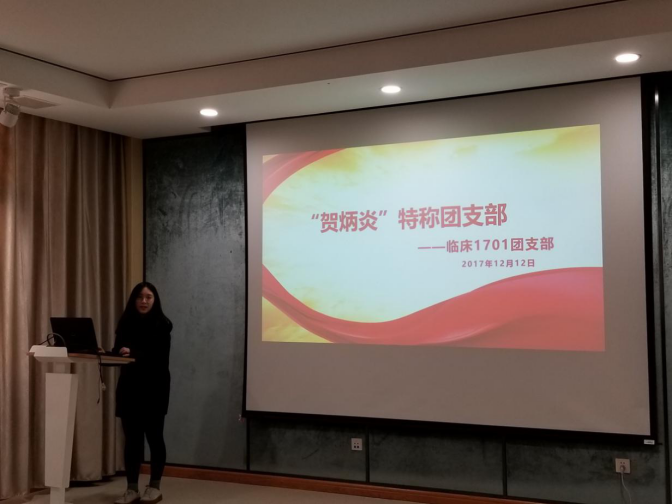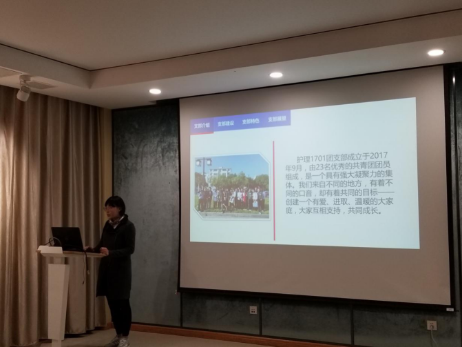 本次活动,2017级各支部分别从支部介绍、支部建设、支部特色、支部展望等部分进行了展示。临床1701团支部展示了多彩的支部建设活动,在未来展望方面还提出令人耳目一新的“微部落”形式;临床1702团支部则在支部展望方面进行更加细化全面的介绍,并希望可以通过支部建设进一步传承和弘扬红色精神;护理1701团支部,通过形式多样的团日活动,体现着该支部内部的温馨;护理1702团支部介绍了本支部开展的各项活动,成立本支部的微信公众号宣传支部活动等。通过激角逐,临床1702团支部在评比中脱颖而出,荣获“贺炳炎”特称团支部的称号,现场进行了授旗仪式。
