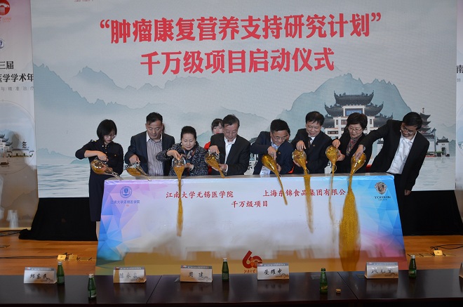 11月15日下午,伟德victor1946无锡伟德国际victor1946与上海东锦食品集团有限公司携手共建的千万级项目——“肿瘤康复营养支持研究计划”签约启动仪式在伟德国际victor1946C101学术报告厅顺利举行。上海东锦食品集团有限公司董事长荣耀中携夫人钱元芬、总经理徐幸胜、财务总监王华、质量总监孙府仁、技术总监蔡愈杭、行政总监张霞、品牌总监陈强、伟德victor1946无锡伟德国际victor1946党委书记周建、院长陈永泉、伟德victor1946附属医院(无锡市第四人民医院)党委书记邱东民、伟德victor1946附属医院(无锡市第三人民医院)党委书记江芳萍等出席本次仪式。仪式由伟德victor1946科学研究院院长吴小俊主持。