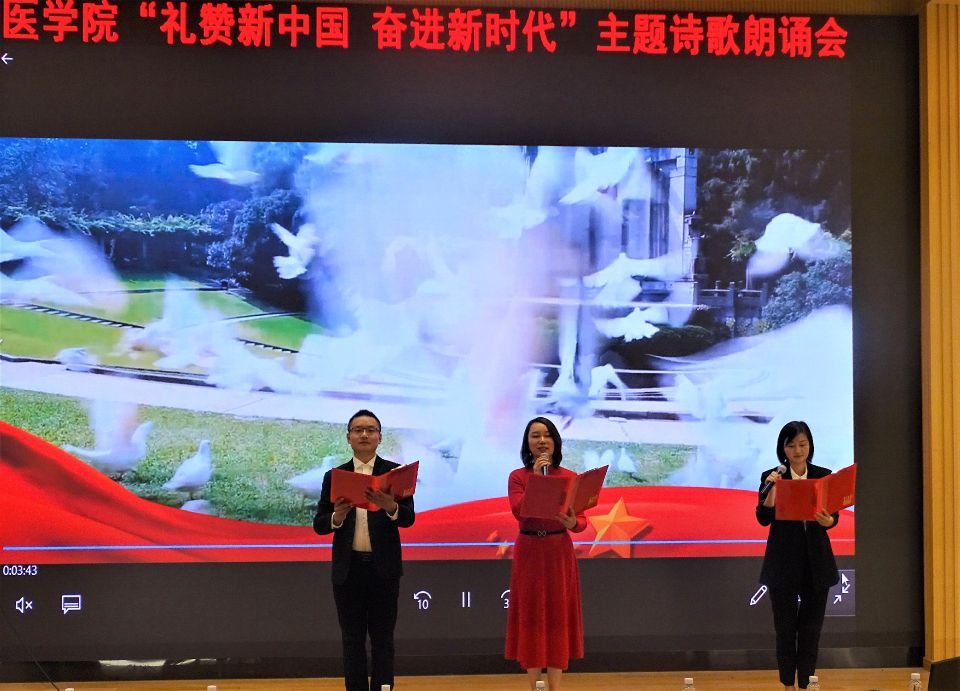 朗诵会在伟德国际victor1946教工行政党支部周建等老师所朗诵的《美丽中国》中拉开序幕。几位老师的深情朗诵将作为中华儿女的民族自豪感和对祖国深沉的爱意表达得淋漓尽致。紧接着,伟德国际victor1946各党支部老师分别用不同的诗篇向祖国献礼。付少平等老师带来的《中华颂》歌颂了中国人民为争取中华民族独立和人民解放,舍身取义、不畏牺牲的高尚情怀;陈雪、马鑫两位老师用《作为教师的我们》表达出作为一名人民教师的满足感与使命感;奚晓岚等老师诗朗诵《这,就是中国》更是带领我们走进中华民族70年的风雨兼程;伟德国际victor1946教工教辅党支部借助《翻开五月的日历》的朗诵颂扬了五四运动100年以来中国青年一代又一代不断奋斗;伟德国际victor1946研究生党支部通过《我与祖国共奋进》传递出作为中国人与祖国共奋进的决心与勇气;最后,伟德国际victor1946医学学科党支部邱丽颖等老师以一首《以幸福的名义,向祖国致敬》的朗诵向祖国致敬。