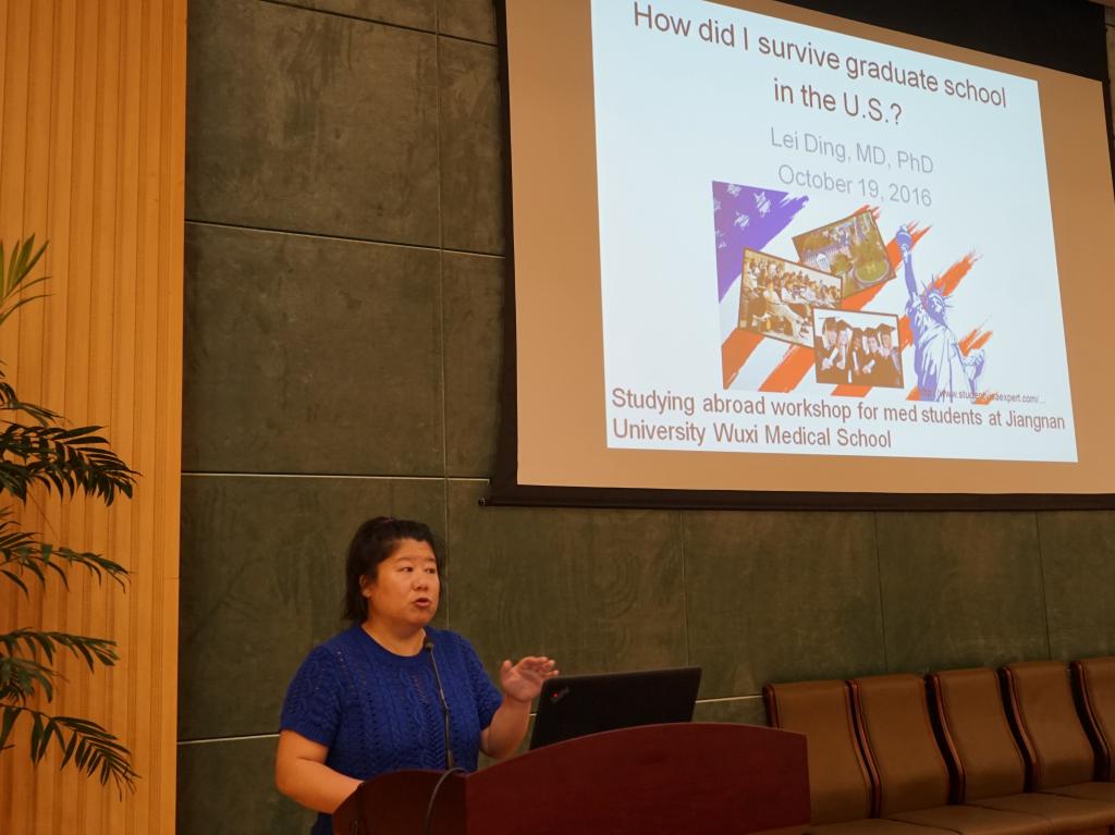 分享会殷始,程洋老师对丁磊、吴静两位老师做了简要的介绍,两位老师在科研及教学方面都有所建树,丰富的海外求学阅历与独特的见解也定会对到场的医学生有所启迪。随后,丁磊老师从自身海外求学趣闻谈起,指出自己在外求学最大的障碍便是语言障碍,建议在场医学生重视学习英文的能力,有出国想法的学生要对托福雅思的报考提前准备。之后,丁磊老师就如何寻找导师,融入团体,提高语言,专注科研,积极交流和适应生活六个方面给学生提供指导,她尤其强调了找一个好导师,发挥自我主观能动性及做科研效率的重要性,她以丰富的阅历作为讲解的载体,诙谐幽默的表达让在场学生在轻松愉悦的氛围内对美国的留学生活有了更进一步的了解。