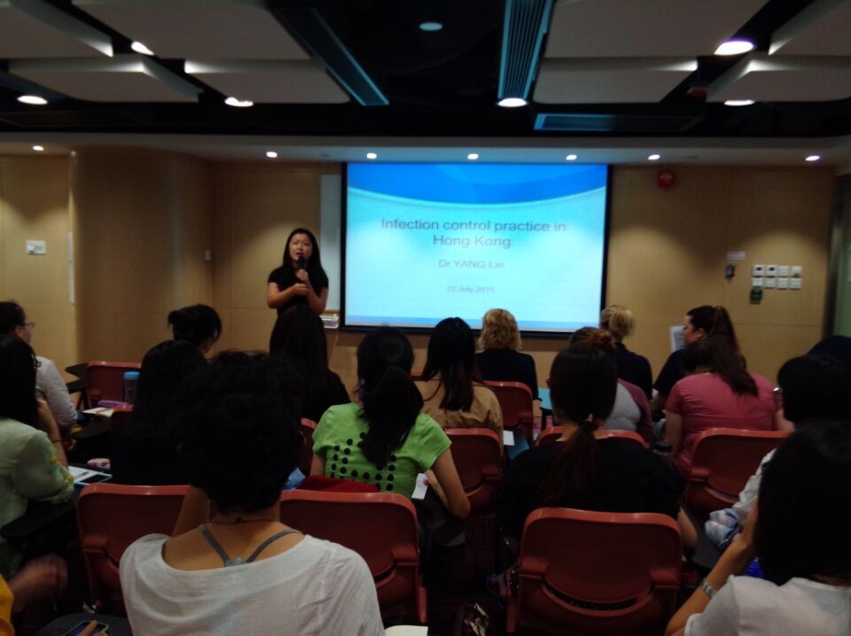 图1.Lecture 1~~Infection Control Practice in Hong Kong 大家都认真聆听YANG Lin老师的演讲。为了让英语水平不够扎实的我们能够听懂,老师中英文时不时轮流讲一遍,让我们从这个讲座得到的收获变得更多~~