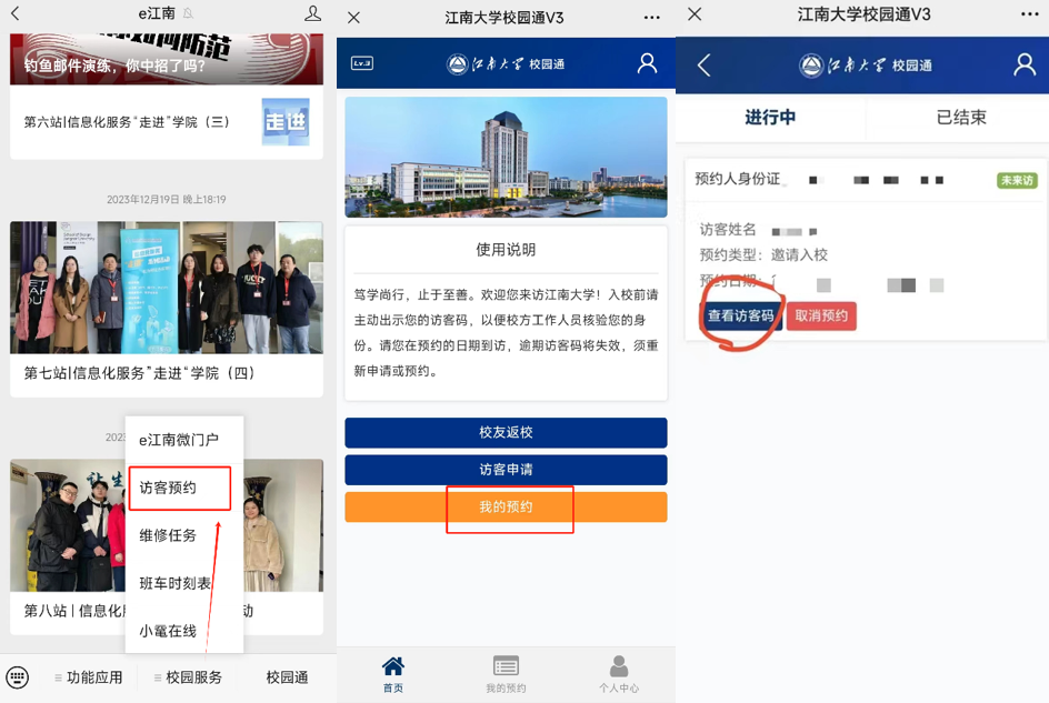 手机关注“e江南”微信公众号,点击屏幕下方“校园服务”中的“访客预约”,进入后点击“我的预约”,点击“查看访客码”即可获得访客码。进入校园时出示访客码。