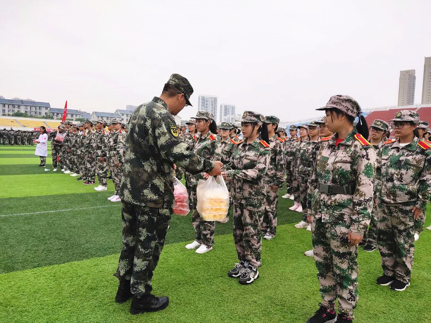 图2 承训武警部队负责人向学生发放慰问品