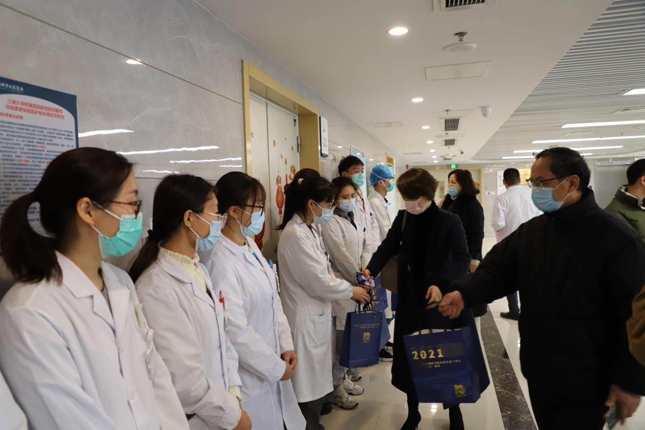 1月19日上午,在附属医院副院长曹宏、教育处处长徐德武等老师的陪同下,伟德国际victor1946党委书记向琪,党委副书记、副院长奚晓岚,副院长、教务处副处长兼附属医院副院长赵鹏,伟德国际victor1946基础医学系系主任吴国胜,护理系系主任蒋玉宇,公共卫生系系主任吴郁,临床1701班班主任邬敏辰,以及研究生秘书、班主任、辅导员老师们来到附属医院,看望和慰问寒假实习学生,了解他们实习期间学习和工作情况,叮嘱他们在完成临床学习的同时要做好自我防护,同时为实习学生送上牛奶、零食礼包等慰问品,给临床带教老师送上鲜花和祝福。