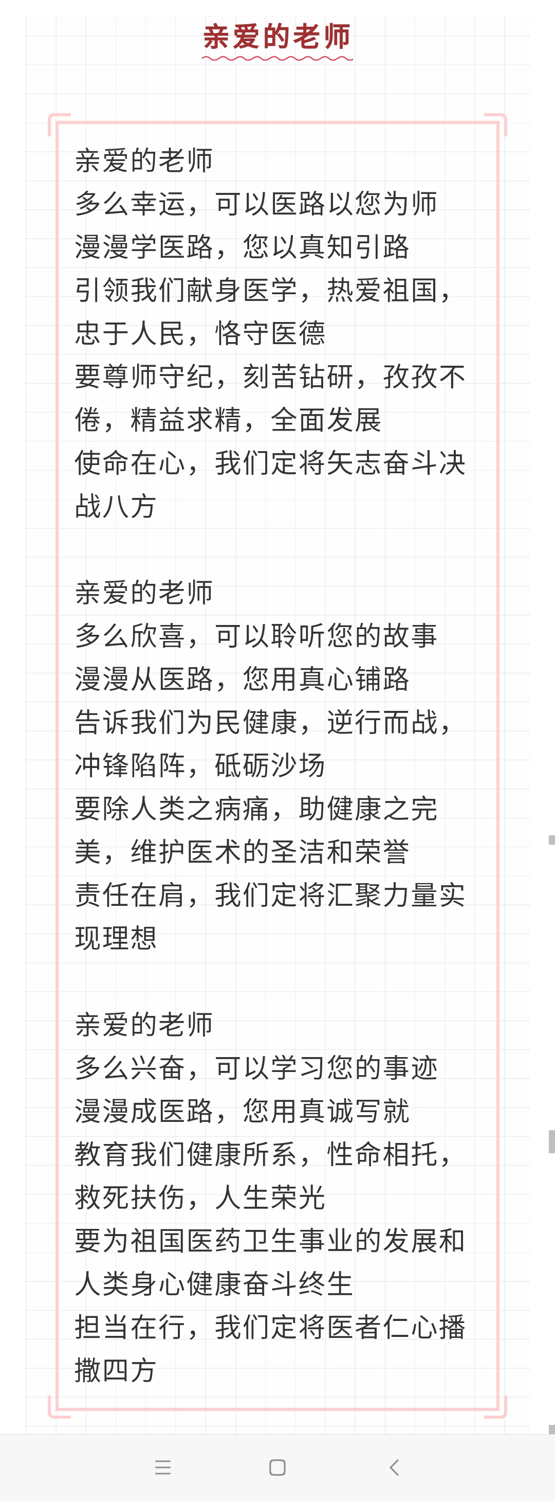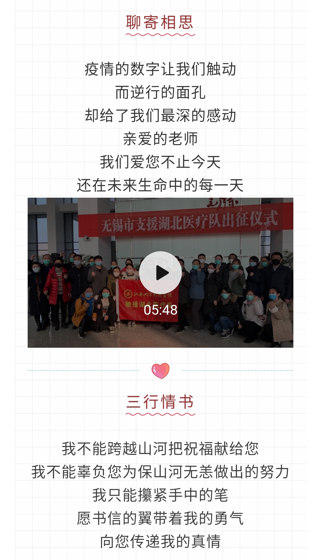 医学生通过录制视频、书写三行情诗等方式表达真情。“老师,您一定要保护好自己”“老师,我们等您平安归来!”……同学们在镜头前露出最美的笑容,诉说着对前线老师们的美好祝愿。“穿上纯白的战衣,支撑起彩色的世界”“待春如期至,等花灿然开,盼君健康归”等三两句告白,一笔一划中充满着同学们对老师的祝福和敬意。老师们在一线收到学生祝福十分感动和感谢,表示一定完成任务平安归来,同时也勉励医学生努力学好自己的专业,将来能更好的为祖国服务,让伟德victor1946引以为傲!