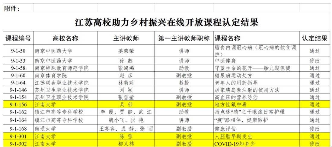 近日,省教育厅公示了江苏高校助力乡村振兴在线开放课程入围名单,我院陈雪老师主讲的《人胚胎早期发生》、吴郁老师主讲的《地方性氟中毒》、柳又祎老师主讲的《COVID-19知多少》3门课程成功入选。