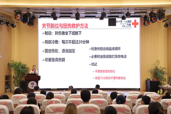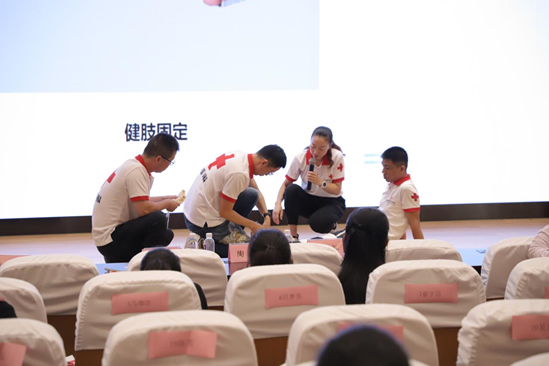 在培训活动中,陶晓首先介绍了红十字精神的起源、内涵以及在中国的发展历史。在理论指导和培训过程中,陶晓指出救助患者的首要前提是保证自身的安全,要做好自身防护并确认周围环境安全。在救护过程中,要善于与人群沟通联系,协同展开救助工作。陶晓详细讲解了心肺复苏法、常见意外伤、烧伤、触电、中毒、溺水、晕厥、急性冠脉综合征等意外事故的常见表现和处理方式,并带领同学们进行分组模拟练习与操作考核。老师们在考核结束后为同学们打分并且给出了专业的点评。最后,老师们组织了理论考试并为考试过程中同学们遇到困难进行了答疑解惑。