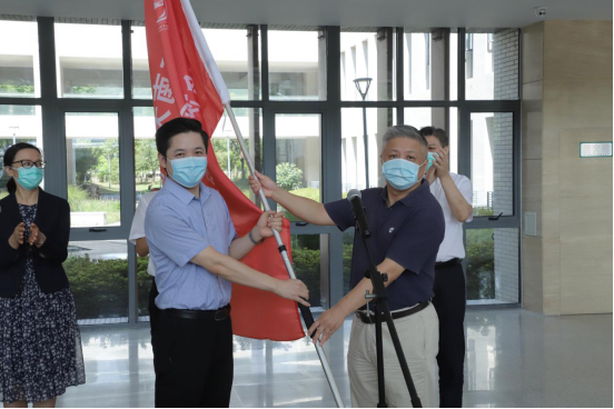 校党委常委、副校长徐岩为志愿者代表伟德国际victor1946院长马鑫授旗