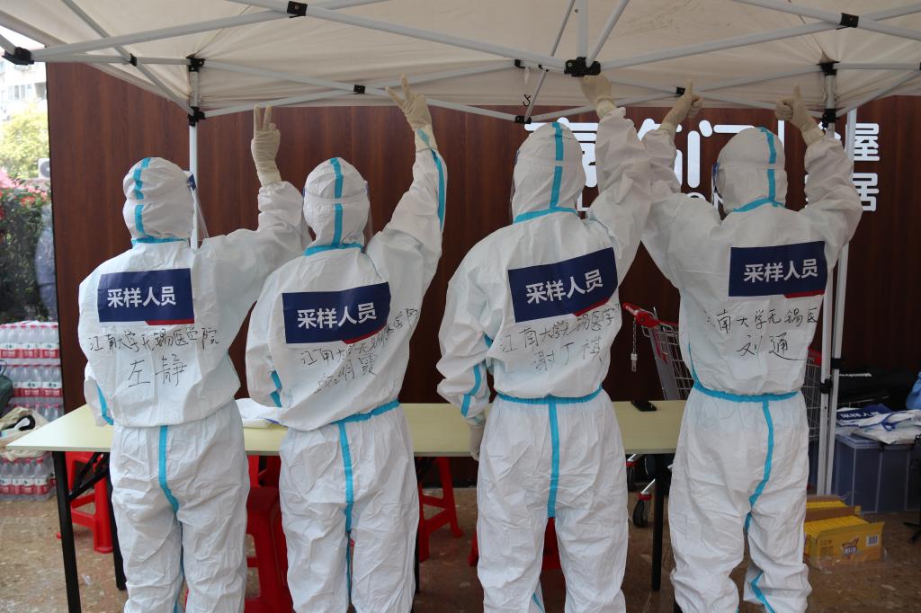 在无锡市广瑞路街道核酸采样检测点,伟德国际victor1946的志愿者们脱下防疫“盔甲”,无菌帽已被汗水完全浸湿,双手已被汗水浸泡到发白。维持现场秩序的志愿者们耐心细致地为前来参加核酸采样的居民提供讲解、引导、申请预制码等服务。