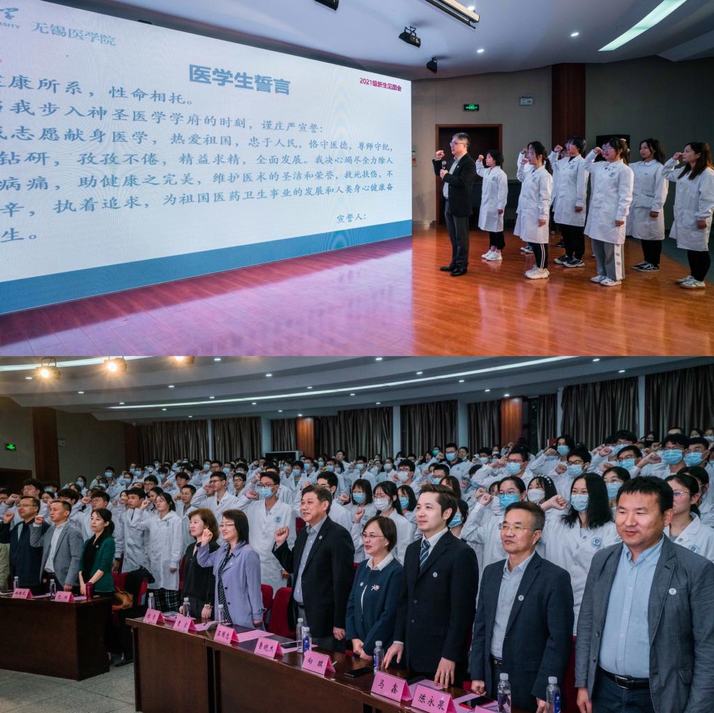 本次见面会还设置伟德国际victor1946特色的佩戴伟德国际victor1946院徽、赠送听诊器仪式,在场的领导老师亲手为新生代表佩戴院徽并赠与听诊器。吕国忠主任带领同学们集体宣读医学生誓词,以此来勉励大家厚德博学、勤业济世,成为一名优秀的江南医学生。临床2103班王艺璇、研究生华雨绮,分别代表本科新生和研究生先生进行了发言。