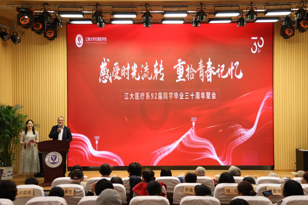 三位92届学生代表发言。江阴同学代表朱敏发言,他用“感恩”和“祝愿”表达三十年来的感悟。他感恩医疗系老师对大家的培养,回忆了三十年前求学的种种趣事,并祝愿伟德国际victor1946未来蓬勃发展,祝愿老师们身体健康,祝愿同学们生活顺利,期待三十年后再次相聚。宜兴同学代表毛伯能发言,他表达了对伟德国际victor1946、对老师和对同学的感谢,回忆了三十年前意气风发、青春年少的岁月,嘱咐大家保重身体,也表达了对日后聚会的殷切期待。无锡同学代表薛明宇发言。他回忆了三十年前与同学们共同求学的峥嵘岁月,感谢老师孜孜不倦的教诲和春风化雨的培养让同学们都各放异彩,在各自的岗位上发光发热。他表示,只要老师有所需要,他和同学们必定全力以赴。最后,他也献上了对伟德国际victor1946、老师和同学的真挚祝愿。