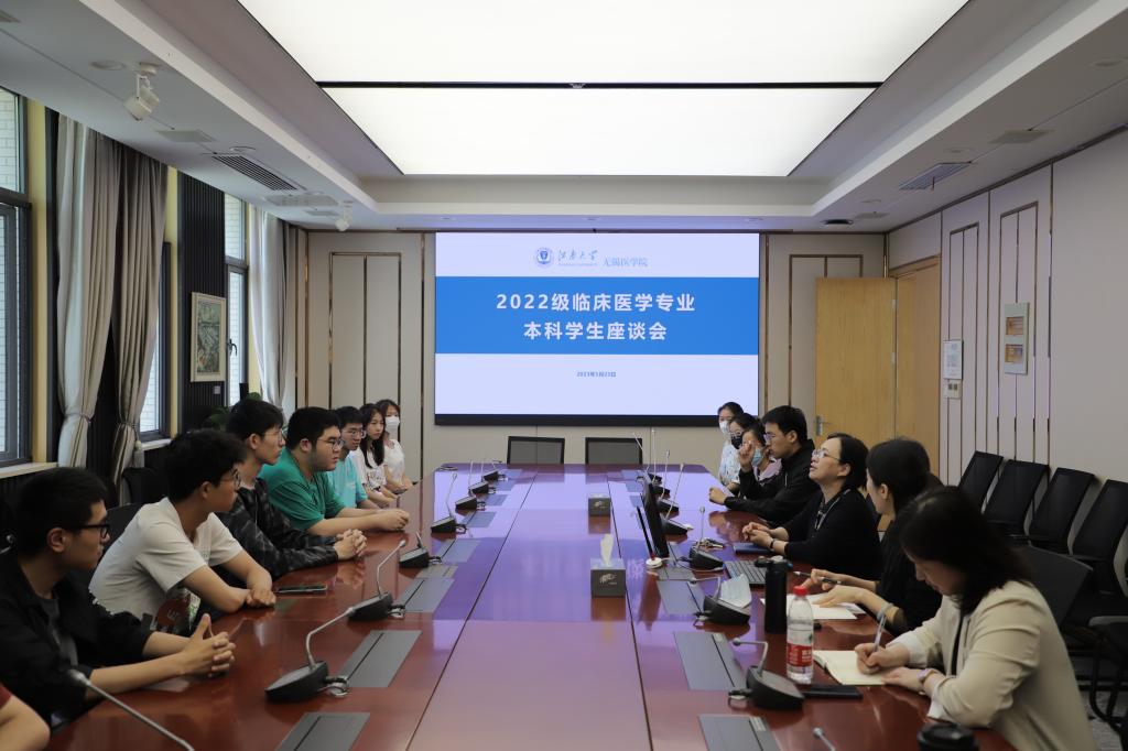 用习近平新时代中国特色社会主义思想涵养青年人才培养,围绕“培养什么人、怎样培养人、为谁培养人”这一根本性问题,无锡伟德国际victor1946于2023年5月23日下午在伟德国际victor1946C106召开2022级临床医学本科生座谈会。无锡伟德国际victor1946党委书记向琪,党委副书记、副院长包羽,副院长陈雪,副院长程洋,教务秘书孙洁芸,2022级辅导员鲁钦正出席座谈会,2022级临床医学本科生代表参加座谈会,会议由向琪主持。