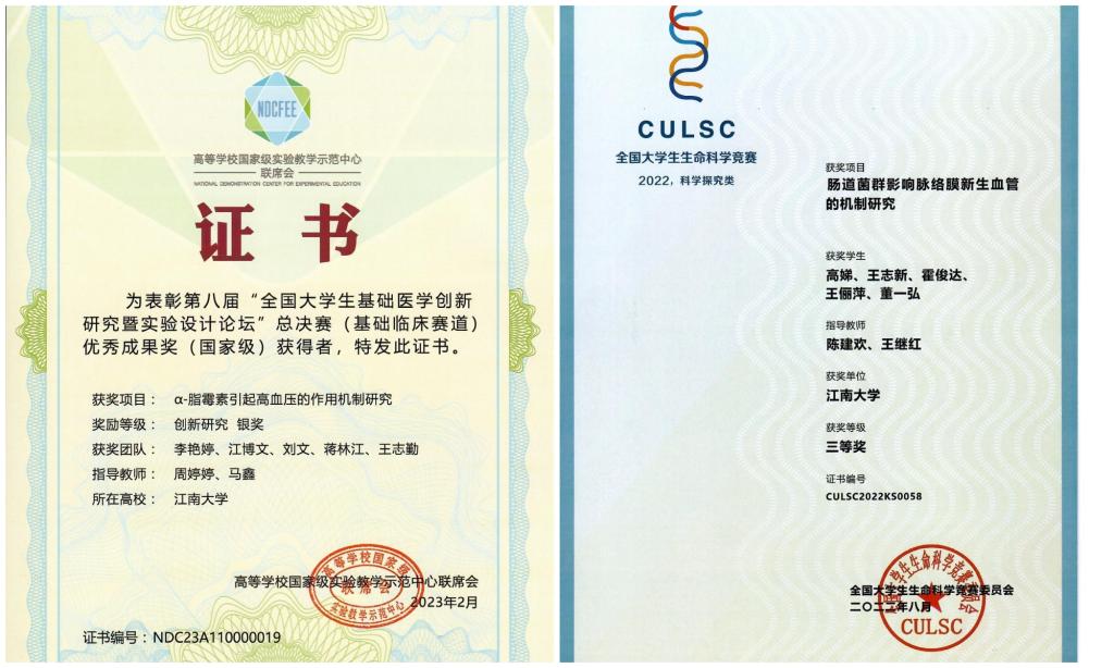 学院成立大学生创新创业训练与学科竞赛指导中心,建立专家库,组织和引导学生参加各级各类学科竞赛。近十年来伟德国际victor1946本科生获全国大学生基础医学创新论坛暨实验设计大赛二等奖2项、三等奖3项;全国大学生生命科学竞赛三等奖3项;江苏省“互联网+”大学生创新创业大赛一等奖1项、三等奖1项;“创青春”江苏省大学生创业大赛银奖1项;中国大学生医学技术技能大赛华东赛区二等奖1项、三等奖2项、单项奖2项;全国大学生基础医学创新研究暨实验设计论坛东部赛区二等奖1项、三等奖2项;全国大学生生命科学竞赛江苏赛区二等奖2项、三等奖1项。