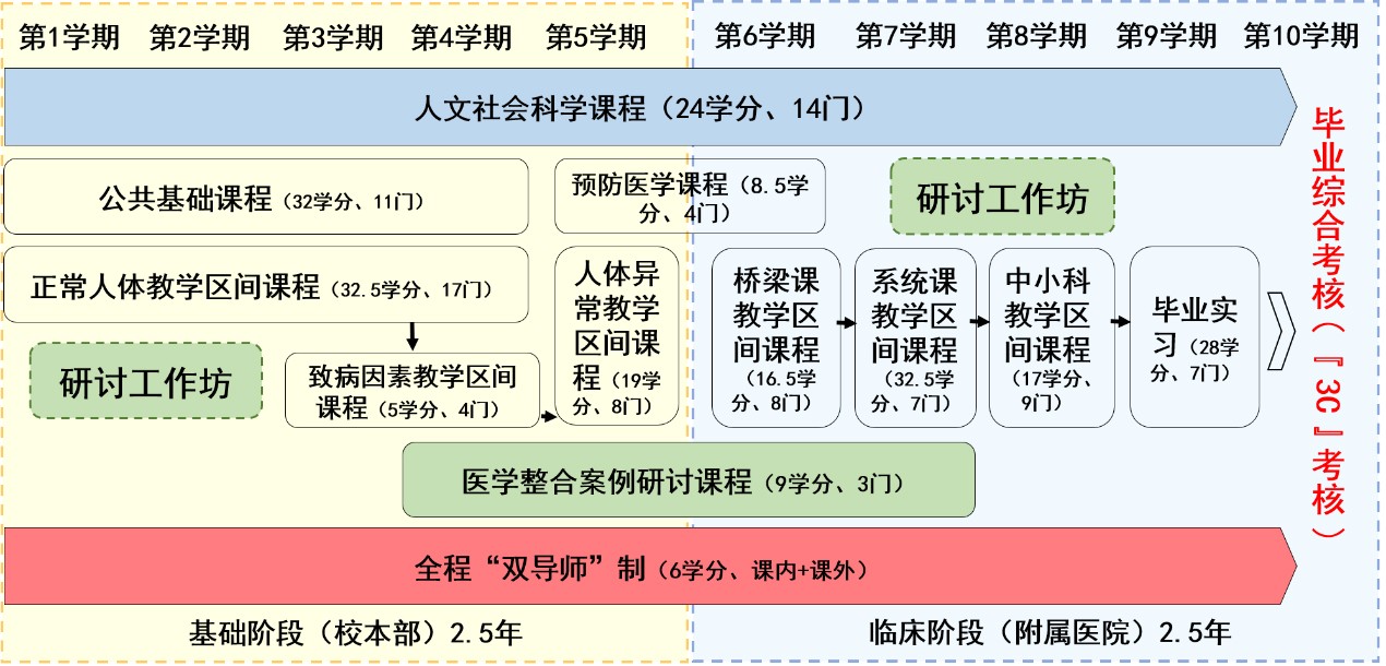 以“基础与临床融合”教育理念为引导,主动接轨国家医学本科教育标准,不断优化临床医学专业培养方案,以“一模式、两全程、三综合”为主线,制订覆盖生命全周期、健康全过程的课程计划,培养医学生服务生命健康的医者精神和知识能力素质。