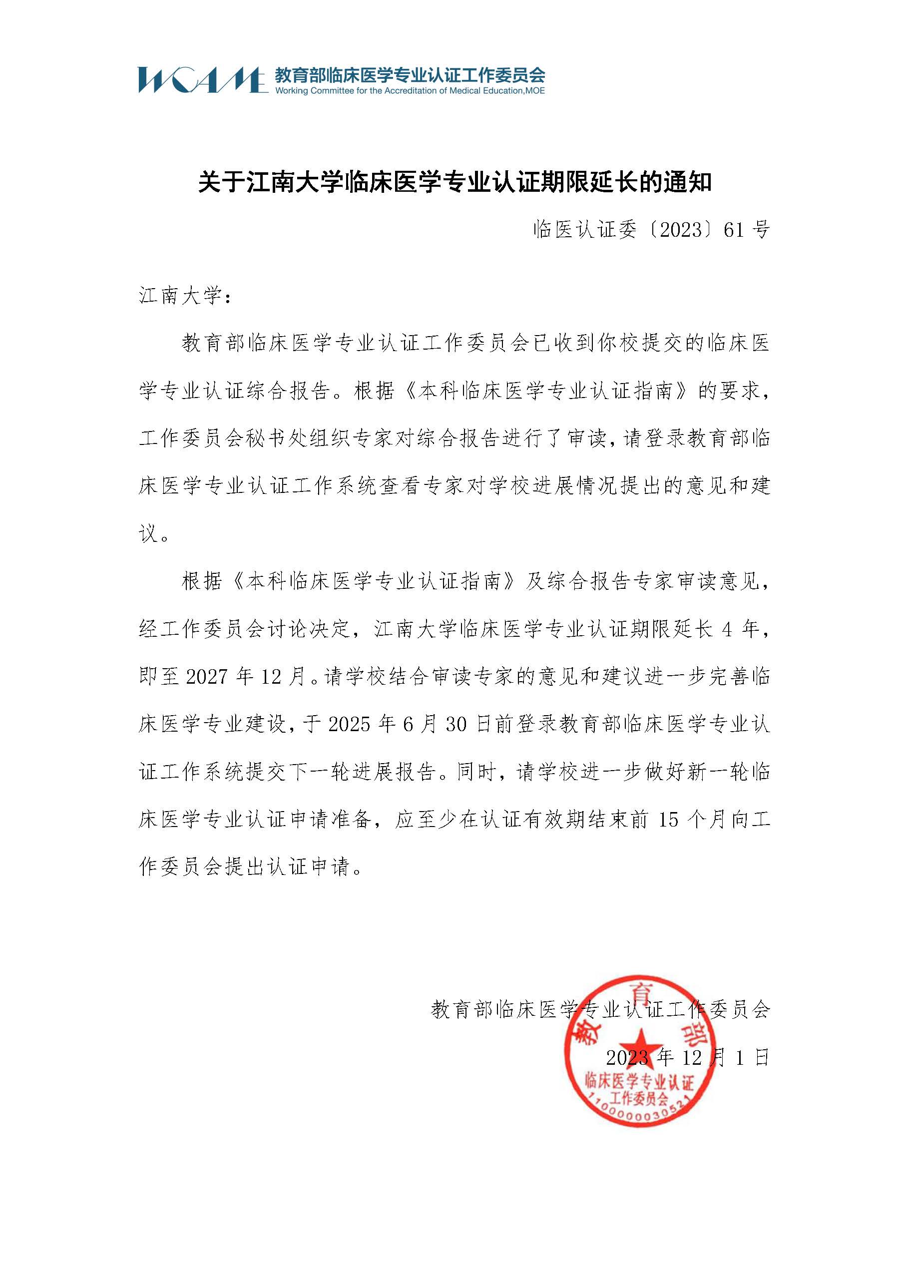 近日,教育部临床医学专业认证工作委员会向我校下达了《关于伟德victor1946临床医学专业认证期限延长的通知》,明确我校临床医学专业认证期限延长4年,总期限达8年,即至2027年12月。