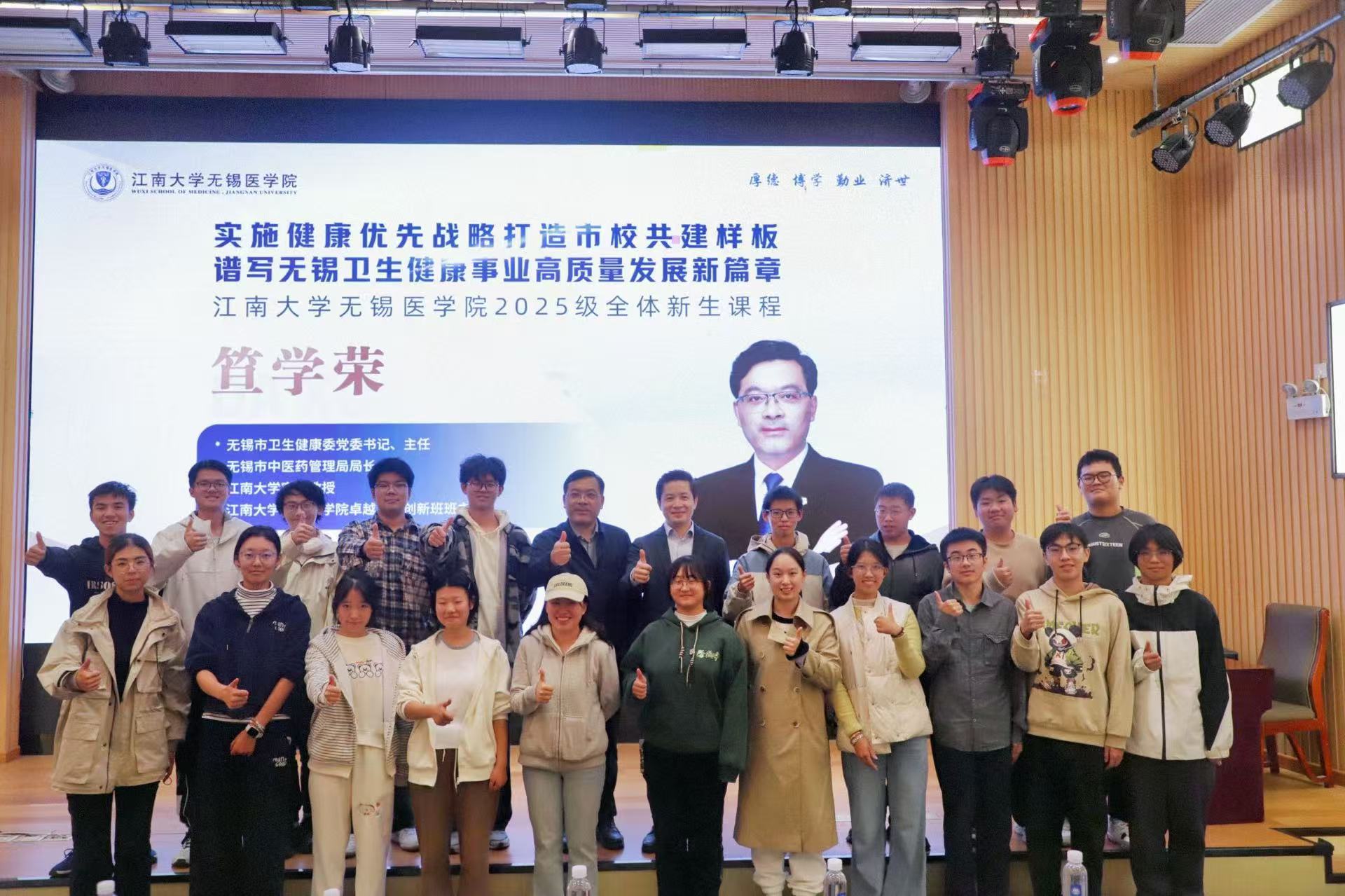 笪书记结合无锡卫生健康事业发展实践,深入解析医学、卫生、健康三者内在逻辑关联,让新生直观理解医学专业的核心价值与使命担当。他指出,无锡卫生健康事业立足从“资源扩容”向“全面升级”跨越,从“合作共建”向“深度融合”迈进,从“以治病为中心”向“以人民健康为中心”转变,在健康城市示范、惠民服务创新、科技人才赋能等领域形成特色“无锡经验”,为医学生提供了广阔的实践舞台与发展空间。
