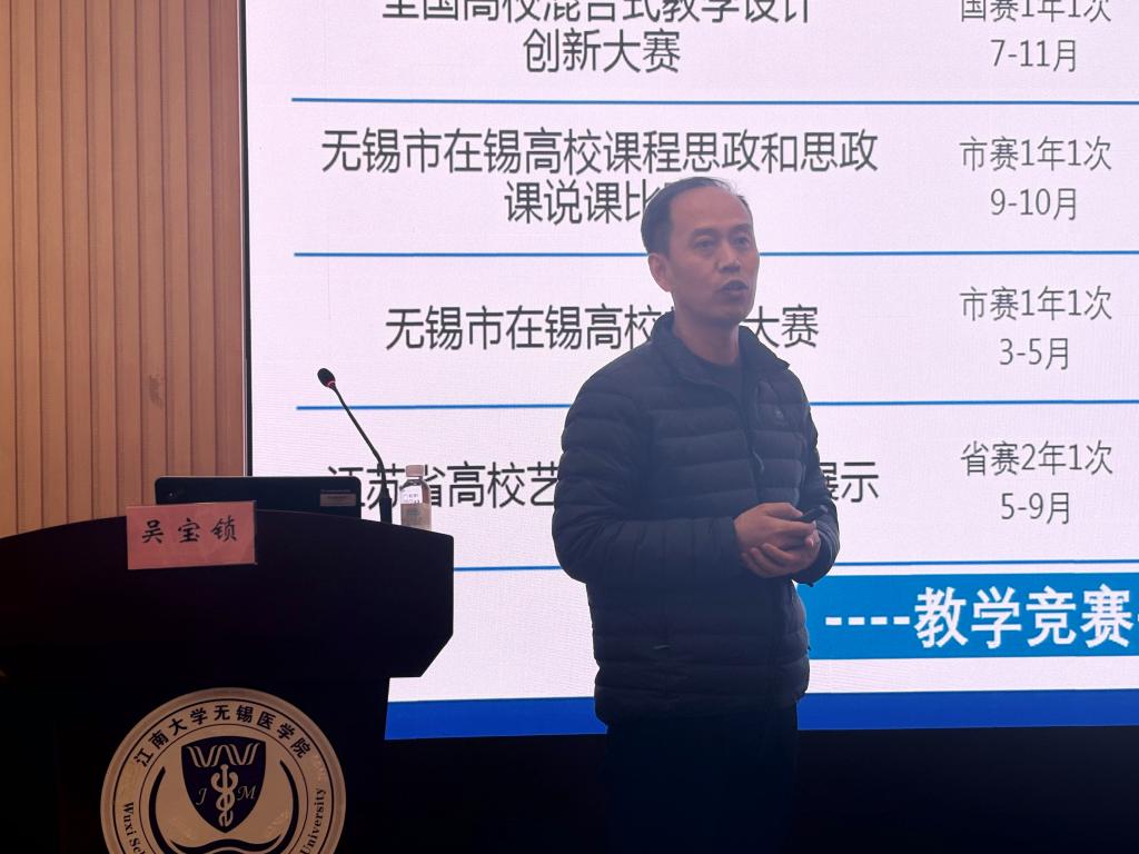 吴宝锁作《以赛促教,提升人才培养质量》专题报告,系统梳理了全国高校教师教学创新大赛、青年教师教学竞赛、混合式教学设计创新大赛等重大赛事的赛制特点与发展趋势。吴处长指出,当前教学竞赛正从“技术展示”向“问题解决”、从“形式创新”向“效果落地”深度转型,尤其注重人工智能与教育教学的融合创新。他详细介绍了学校为参赛教师提供的激励政策、资源支持与培训体系,鼓励临床教师积极组建团队、凝练特色、参与竞赛,将备赛过程转化为切实的教学改革实践,实现“以赛促教、以赛促学、以赛促建”的良性循环。