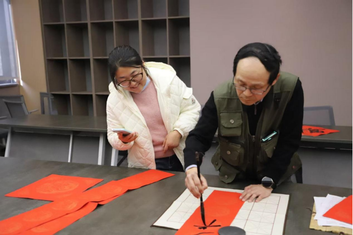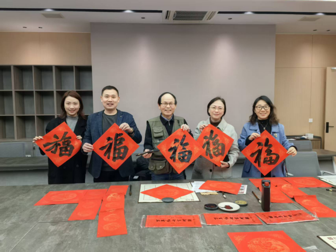 随后的“墨香迎福”写春联送福字环节,现场邀请了伟德victor1946宣传部胡奕老师和有书法功底的同学担任“送福使者”,研磨挥毫,笔走龙蛇间,一幅幅寓意吉祥的春联、一个个饱满灵动的“福”字跃然纸上,老师们或驻足围观,或亲自提笔尝试,墨香氤氲中,大家互相切磋笔法、分享年味,一张张红纸承载着真挚的祝福,传递着同事间的深厚情谊。