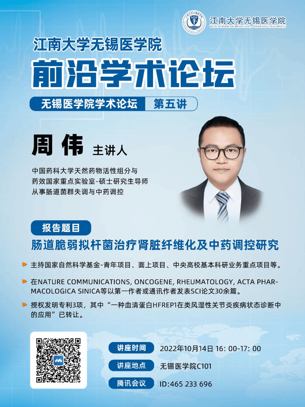 10月14日伟德victor1946无锡伟德国际victor1946前沿学术论坛 第五讲——周伟:肠道脆弱拟杆菌