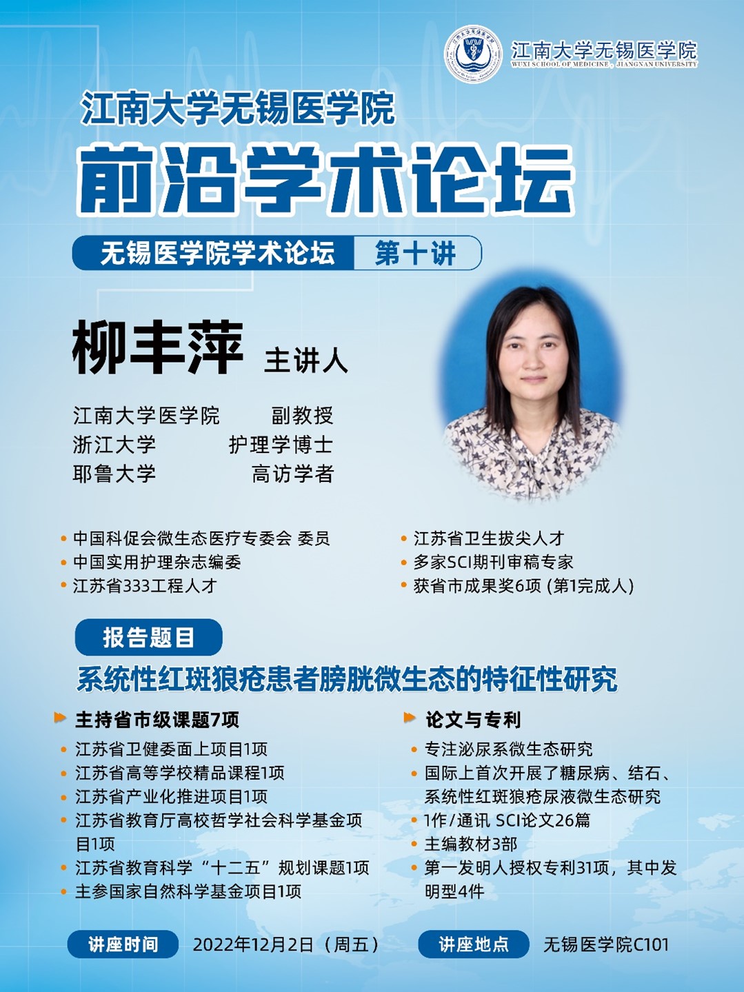 12月2日伟德victor1946无锡伟德国际victor1946前沿学术论坛 第十讲 柳丰萍——系统性红斑狼疮患者膀胱微生态的特征性研究
