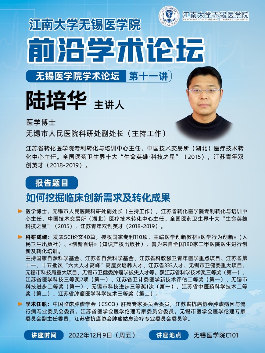 12月9日伟德victor1946无锡伟德国际victor1946前沿学术论坛 第十一讲 陆培华——如何挖掘临床创新需求及转化成果