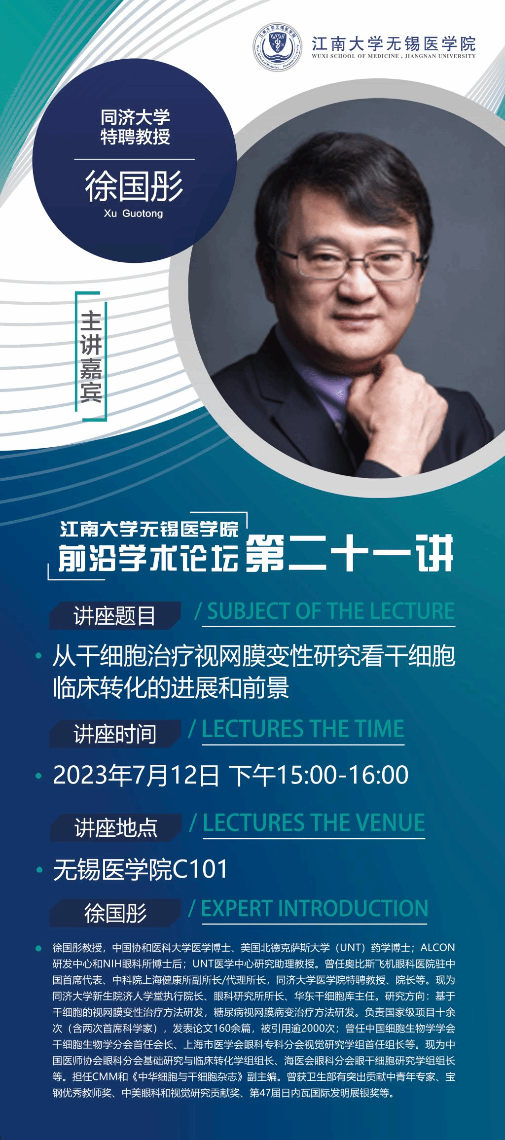 7月12日伟德victor1946无锡伟德国际victor1946前沿学术论坛第二十一讲 徐国彤教授——从干细胞治疗视网膜变性研究看干细胞临床转化的进展和前景