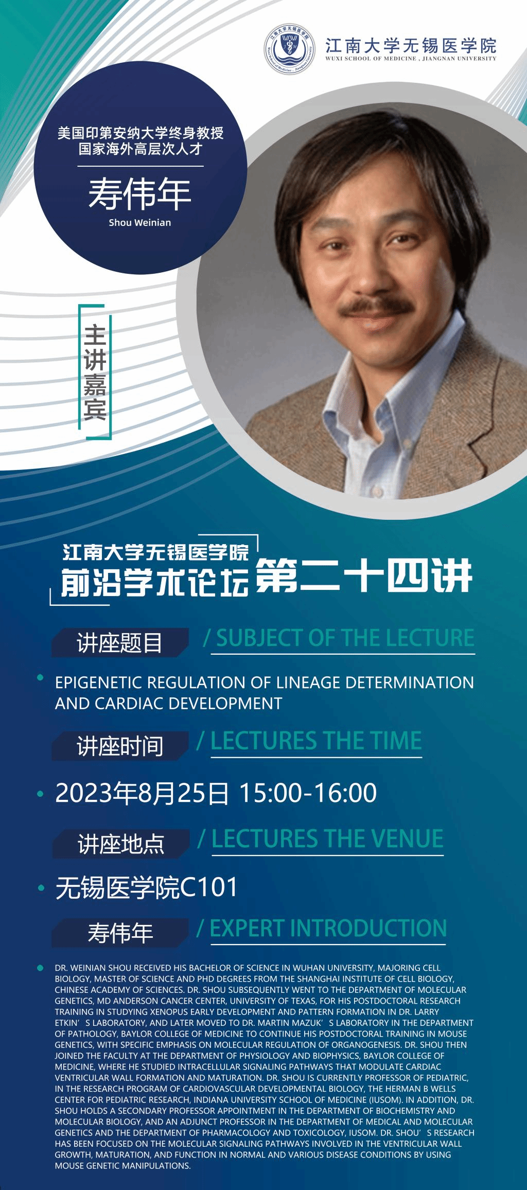 8月25日伟德victor1946无锡伟德国际victor1946前沿学术论坛第二十四讲 寿伟年教授——Epigenetic regulation of lineage determination and cardiac development