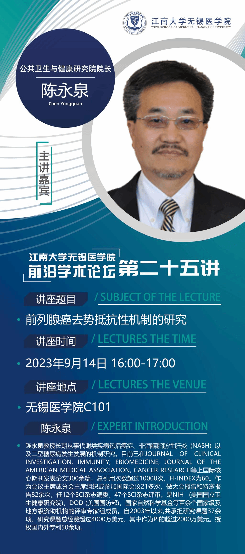 9月14日伟德victor1946无锡伟德国际victor1946前沿学术论坛第二十五讲 陈永泉教授——前列腺癌去势抵抗性机制的研究