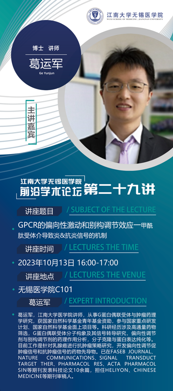 10月13日伟德victor1946无锡伟德国际victor1946前沿学术论坛第二十九讲 葛运军教授——GPCR的偏向性激动和别构调节效应—甲酰肽受体介导致炎&抗炎信号的机制