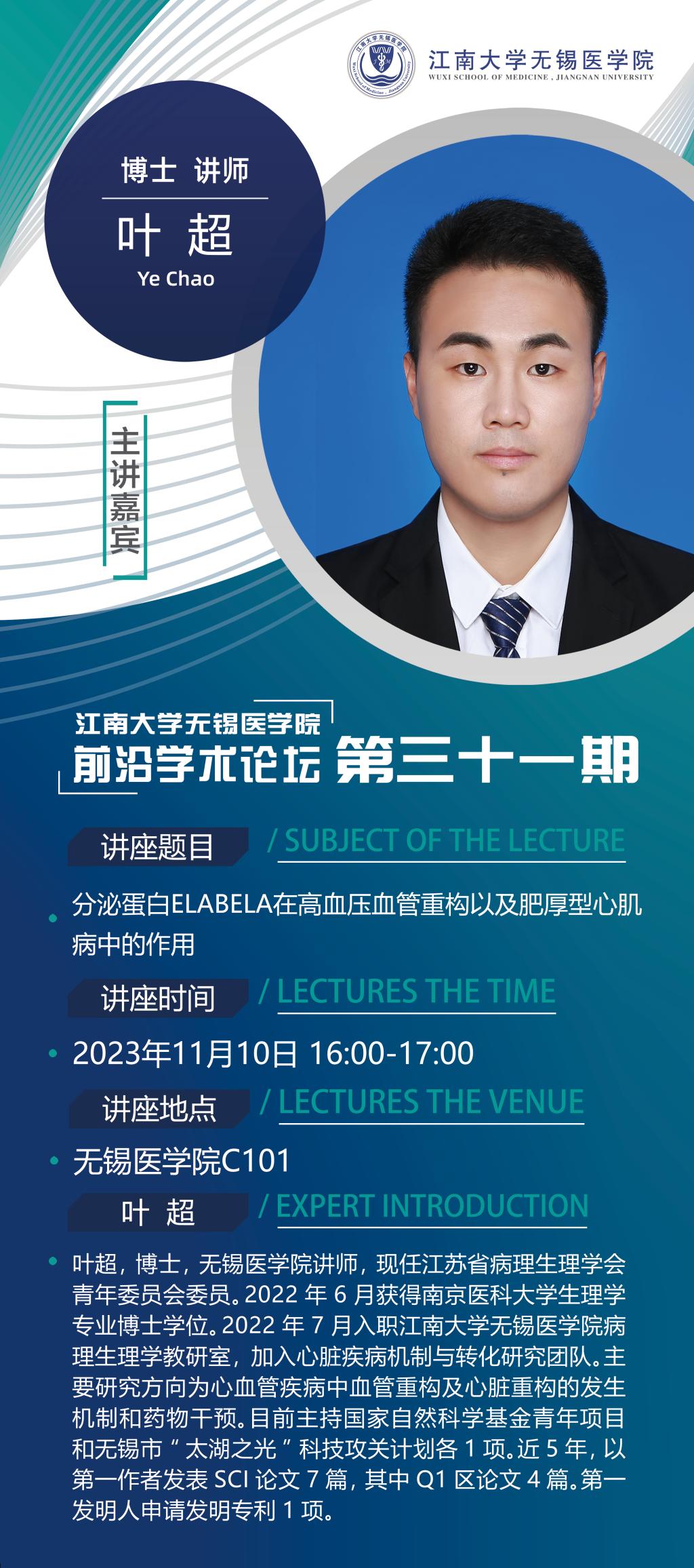 11月10日伟德victor1946无锡伟德国际victor1946前沿学术论坛第三十一讲 叶超老师——分泌蛋白ELABELA在高血压血管重构以及肥厚型心肌病中的作用