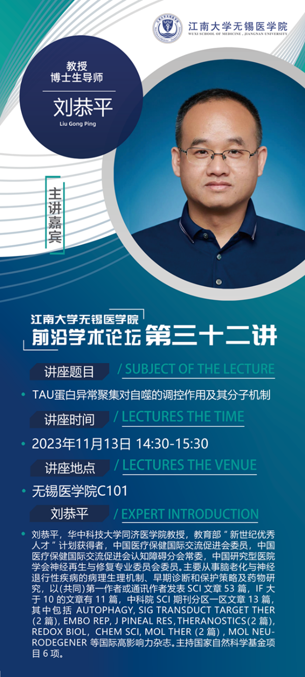 11月13日伟德victor1946无锡伟德国际victor1946前沿学术论坛第三十二讲 刘恭平教授——Tau蛋白异常聚集对自噬的调控作用及其分子机制