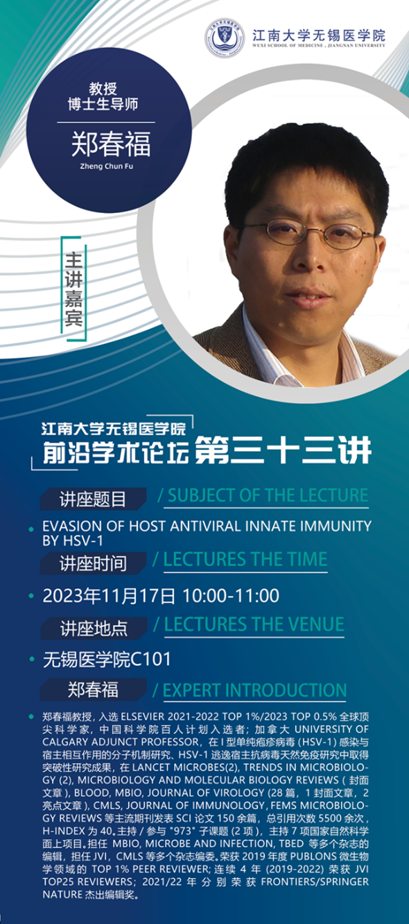 11月17日伟德victor1946无锡伟德国际victor1946前沿学术论坛第三十三讲 郑春福教授——Evasion of host antiviral innate immunity by HSV-1