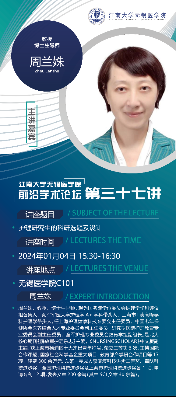 1月4日伟德victor1946无锡伟德国际victor1946前沿学术论坛第三十七讲 周兰姝教授——护理研究生的科研选题及设计