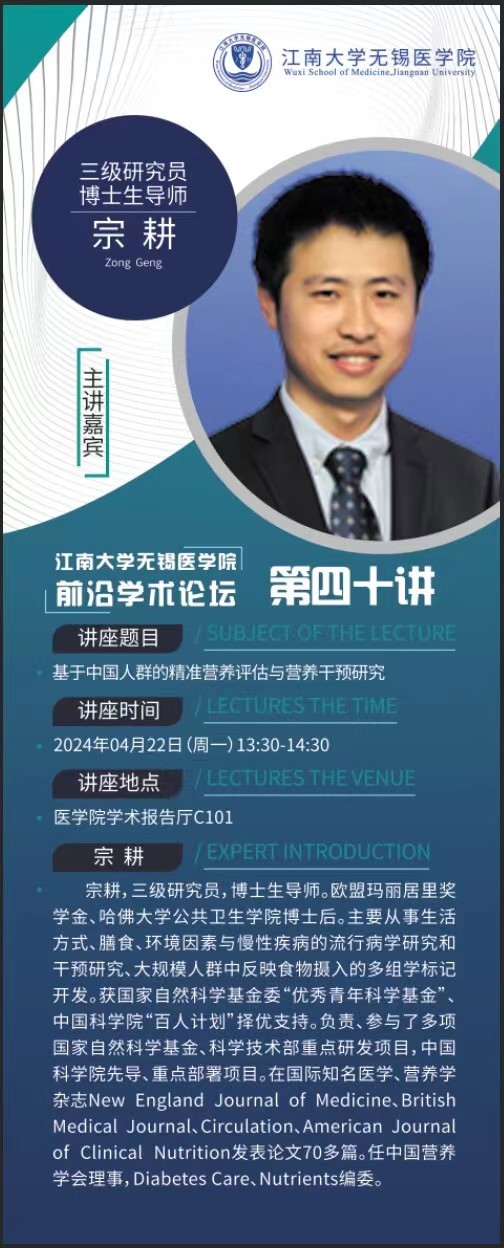 4月22日伟德victor1946无锡伟德国际victor1946前沿学术论坛第四十讲 宗耕研究员——基于中国人群的精准营养评估与营养干预研究