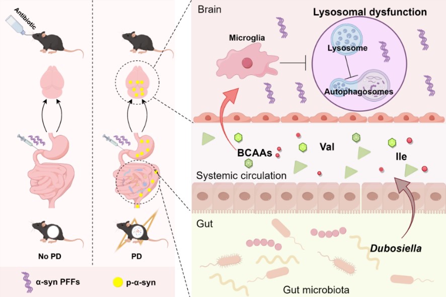 2025年4月,伟德国际victor1946申延琴教授《Brain Behavior and Immunity》发表了题为“Gut microbiota promote the propagation of pathologic α-syn from gut to brain in gut-originated Parkinson's disease model of mice”的研究性论文。肠道菌群和α-syn传播被证实是帕金森病发展的关键因素,虽然肠道是α-syn病理的起源之一,但肠道菌群如何调控肠起源α-syn病理发展并不明确。该研究首次揭示了肠道菌群在肠起源帕金森病中的动态变化规律,首次证实肠道菌群(尤其是Dubosiella)是推动α-syn病理从肠到脑传播的关键因素,其通过BCAA代谢紊乱导致溶酶体功能障碍,最终加剧α-syn聚集。这一发现为PD的早期干预提供了新靶点:调控肠道菌群或靶向BCAA代谢可能成为延缓PD进展的有效策略。