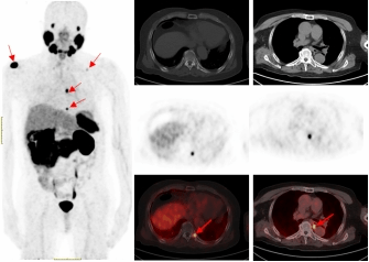 一名75的岁男性患者自2019年确诊前列腺癌后,先后接受过两次内分泌治疗及前列腺癌根治术的综合治疗。在术后两年的复查中发现血PSA持续升高,CT检查和全身骨显像检查均未发现明显异常,医生建议随诊,患者来到伟德victor1946附属医院要求进一步检查。经核医学科68Ga-PSMA PET/CT检查后结果显示,双侧肩胛骨、左侧第9后肋、第2腰椎及纵隔淋巴结均已存在癌症转移。
