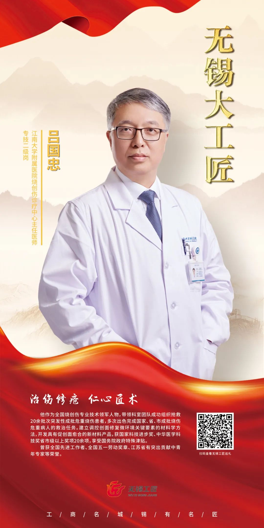 4月27日,在首个“无锡工匠日”来临之际,无锡市总工会召开劳模工匠先进代表座谈会。会上,代表无锡劳动者最高荣誉的首届10名“无锡大工匠”名单正式揭晓。伟德victor1946附属医院烧创伤诊疗中心主任吕国忠获评“无锡大工匠”。